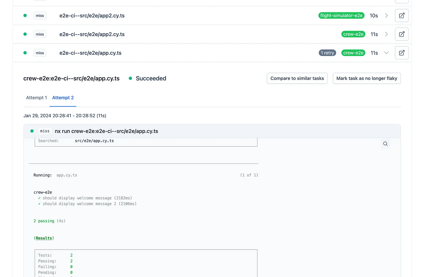 There are some tasks that will fail or succeed in CI without any changes to the task's code. These are flaky tasks and in order to merge a change in unrelated code, developers need to manually re-run the entire pipeline until that flaky task succeeds. Because Nx is already tracking inputs and outputs of tasks, it knows when a task is flaky. Now, Nx Cloud will automatically re-run a flaky task if it fails, without a developer needing to manually trigger it.